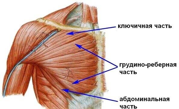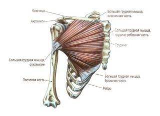 Наиболее крупная структура грудной клетки, которая покрывает спереди значительную площадь, верх и середину передней поверхности. Она принимает участие в образовании передней стенки подмышки, создает рельефный рисунок, в большей степени может выпирать у мужчин. У девушки в период полового созревания мускул участвует в формировании бюста и оказывает влияние на рельеф, объем и форму молочной железы. Название на латинском языке – musculus pectoralis major. Сухожильные пучки берут начало от нижнего края внутренней части ключицы, от среднего края грудины и хрящевых частей ребер. Мышечные волокна переплетаются между собой, а затем посредством крупного соединительнотканного сухожилия прикрепляются к гребню большой головки плечевой кости.