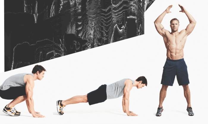 Здесь много запоминать тебе не придётся. Все довольно просто: классический бёрпи слегка модифицирован. Оказавшись в твоей любимой позиции для отжимания, несколько раз (а именно четыре) разведи и сведи ноги в разные стороны, слегка при этом подпрыгивая на носках. Затем вернись в позицию, с которой мы начали объяснение, выпрыгивая как можно выше. Весь этот комплекс увеличивает нагрузку на сердце, устраивая тебе проверку на прочность, смотря, сможешь ли ты устоять на ногах во время прыжка и посадки.