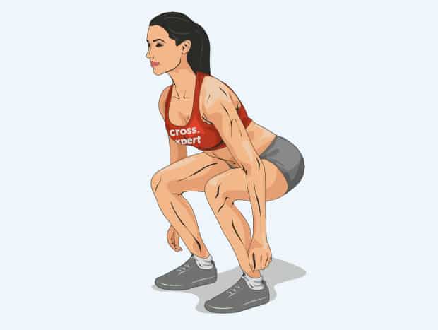 - Нужно поставить ноги на ширине плеч, а затем присесть. Ладони при этом касаются пола перед ступнями.