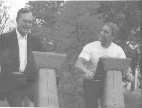 Мы с губернатором Питом Уилсоном выполняем отжимания в день Большой калифорнийской тренировки.