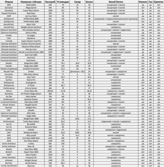 Осталось ответить на главный вопрос: Какой же производитель гейнера наиболее ответственно относится к своей задаче? Состав такой пищевой добавки может существенно отличаться в зависимости от марки.