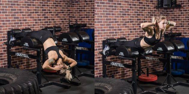 Вставьте ноги под ролики GHD-тренажёра, уберите руки за голову. Опустите корпус, а затем вернитесь в исходное положение. В верхней точке поднимайтесь выше параллели спины с полом и смотрите вперёд. Выполняйте плавно и под контролем, без раскачки и рывков.