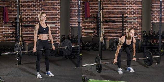 На выдохе выпрямитесь в тазобедренном и коленном суставах, удерживая спину прямой. Ведите штангу близко к голеням, практически касаясь их. Опустите её на пол и повторите.