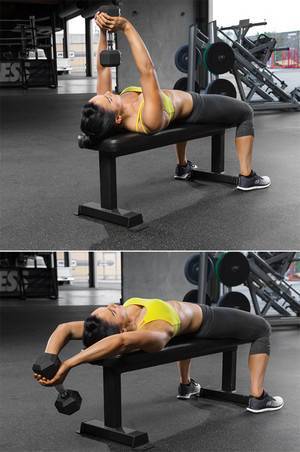 - Базовый жим гантели. Процедура проводится в медленном ритме, чтобы избежать травм локтей, они должны оставаться напряженные.