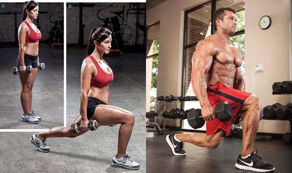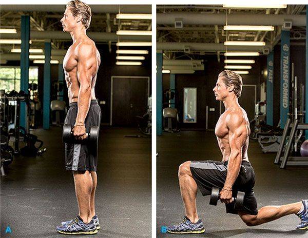 Варьируя ширину шага при выполнении выпадов с гантелями в руках, можно смещать нагрузку в сторону ягодиц или в сторону квадрицепсов: