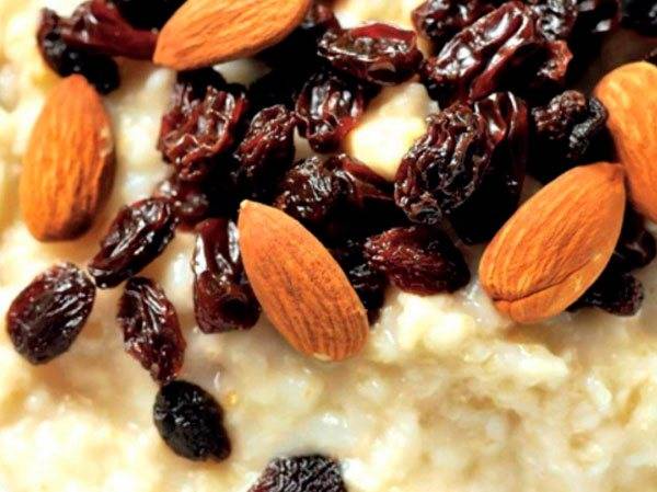 - На завтрак, обед и ужин необходимо есть овсянку с фруктами или с сухофруктами (любыми). Готовится она из следующих компонентов: овсяная каша (250 г), кусочки свежих фруктов или любые сухофрукты (100 г), орехи (50 г), 3 чайных ложки мёда. Данное количество пищи делится на три порции и съедается во время основных приёмов пищи.
