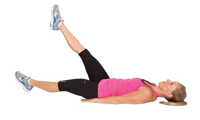 - Подъемы ног. Исходное положение — лежа. Далее поднятие прямых ног в воздух, при этом стараясь не работать торсом. Продержаться в таком положении несколько секунд и повторять заново около 40 раз.