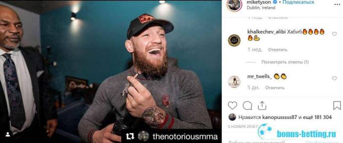 Известный боец ММА, Конор Макгрегор раскурил «трубку мира» вместе с легендарным боксером, закопав топор войны и уладив все ранние разногласия. Также Макгрегор заявил, что травка у Майка отменная. Видимо старшее поколение таким образом делится знаниями и накопленным опытом со своими приемниками. Для здоровья конечно пользы мало, зато настроение отличное и общий язык найти помогло.