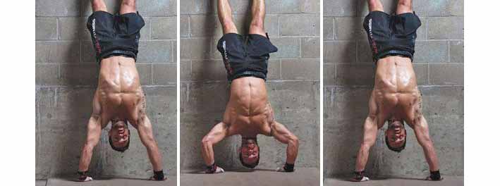 Чтобы облегчить себе задачу и принять нужную позу, повернитесь спиной к стене, наклонитесь и упритесь рукам в пол. Затем поднимите ногу и сделайте упор в стену, после чего поднимите вторую ногу. Выпрямляйте вторую ногу, но при этом держите под контролем контакт со стеной. Придайте прямое положение туловищу, не делая резких движений, очень медленно. Приступайте к изгибам в руках только тогда, когда почувствуете, что на руках держитесь уверенно.