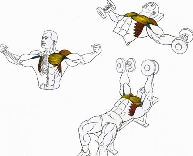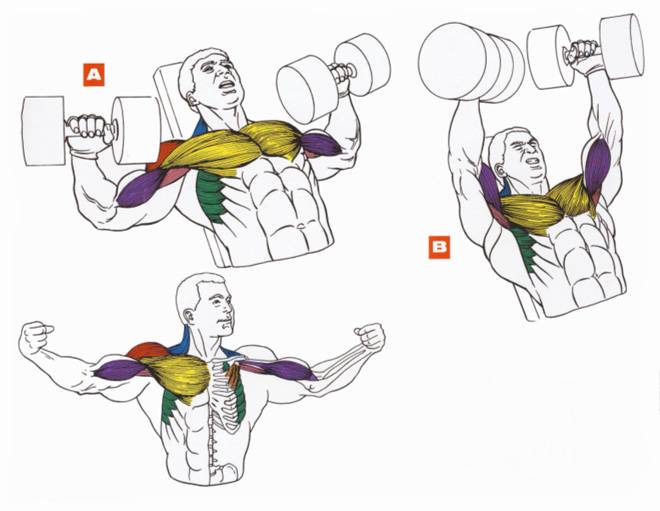 - Жим штанги лежа + жим гантелей на наклонной скамье.