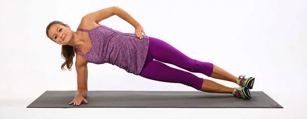 - Лечь на бок, положить локоть под плечом, а ноги выпрямить. Опираясь на предплечье, приподняться и подержать тело прямо, при этом вес должен распределиться на стопу и руку. Продержаться в данном положении сколько сможете, затем переменить сторону.