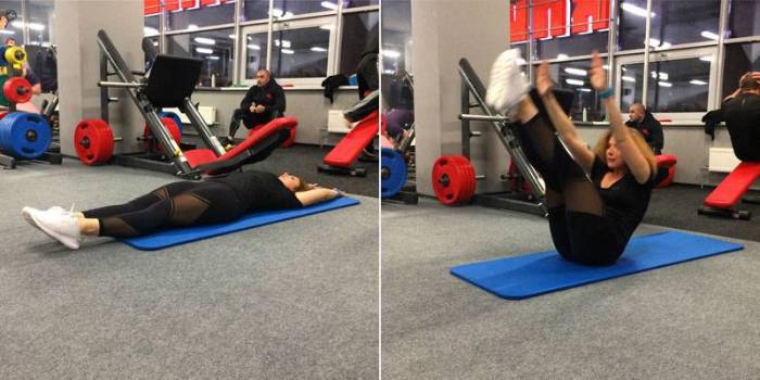 Это непростое упражнение, доступное тем, кто уже освоил стандартные техники работы с прессом. Корпус нужно поднимать за счет мышц живота, чтобы не перегружать спину и поясницу. Возможно, понадобится подкрутить коврик или положить мягкий плед под ягодицы, чтобы не испытывать дискомфорт в районе копчика.