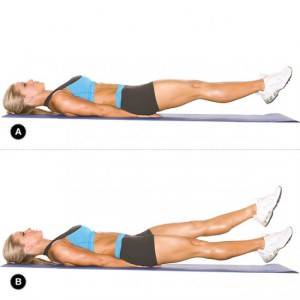 Скручивания. Лягте на спину, пальцы рук на затылке (не сцеплены), локти направлены в стороны. Ноги согнуты в коленях, стопы на полу. Медленно отрывайте затылок, плечи и лопатки от пола. Нижние ребра словно стремятся к бедрам. Поясницу не отрывайте от пола. Живот втянут. Медленно вернитесь в исходное положение. Работает прямая мышца живота. Сделать 3-4 подхода по 20 повторов. Между подходами отдых 30 секунд.