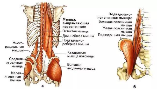 - Мышца, выпрямляющая позвоночник (делится на 3 части — подвздошно-реберную, остистую и длиннейшую мышцы).