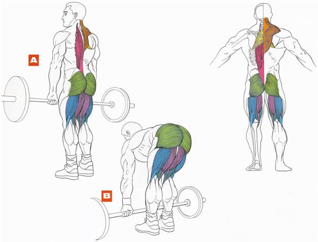 Сложное, но очень эффективное движение, которое обязательно следует включать в комплекс упражнений на мышцы спины с гантелями. Его основная задача – развитие мышц поясницы.