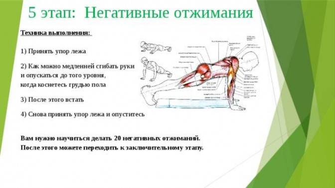 Они полезны тем, что фокусируются на эксцентрической части отжимания — опускании вашего тела на землю. Исключая элемент самого «отжатия», вы можете сосредоточиться на контроле своего тела по мере набирания силы. Это упражнение обязательно поможет вам добиться впечатляющих результатов.