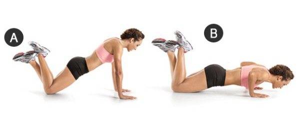 Отжимайтесь с колен. При таком положении часть нагрузки с мышц уходит, это еще один вариант быстро научиться отжиматься от пола. При выполнении упражнения старайтесь медленно, и как можно ниже, опускать грудную клетку к полу.