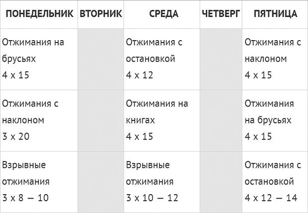 | Отдых | Отжимания на трицепс 8–12 повторов, 1 подход | Алмазные наклонные отжимания 8–12 повторов, 1 подход | Базовые отжимания от пола Отжимания на трицепс