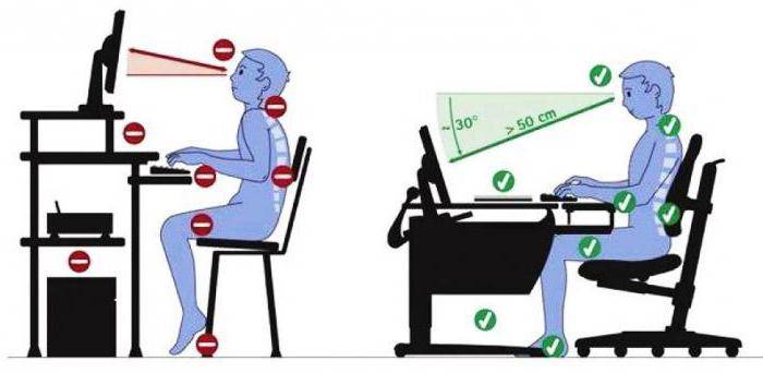 Монитор должен находиться примерно на расстоянии вытянутой руки, а при работе на клавиатуре нужно обеспечить рукам минимальный изгиб запястья. Сидеть нужно прямо, а стул для работы за компьютером выбирать такой, который поддержит нижнюю часть спины. Кроме того, край стула не должен давить на нижнюю часть коленей.