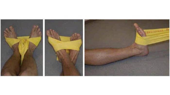 - Сидя на стуле или полу, стопы вместе и соединены эластичным бинтом. Ставим стопы на пятки, а носки разводим, прикладывая необходимые усилия.