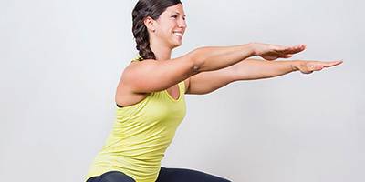 - выполняется глубокое приседание, копчик при этом тянется назад, образуя небольшой прогиб в пояснице в крайней нижней точке;