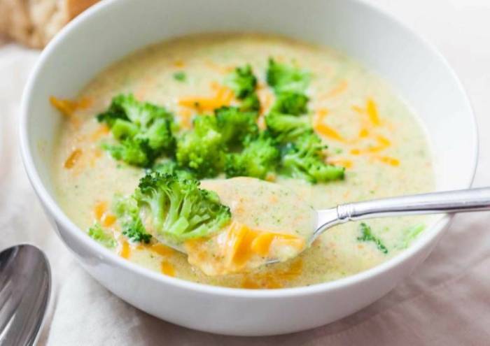 В чаше мультиварки соединить бульон с маслом, сливками, сливочным сыром. Туда же положить брокколи и пармезан. Поставить таймер на 3 часа. Потом всыпать натертый чеддер. Сдобрить специями и солью. Перемешать. В тарелку можно положить пластик бекона для украшения.
