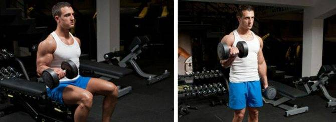 - Сидя. Руки выполняют те же действия, только снаряд расположен на коленях. Необходимо сесть на скамью, ступни поставить на ширину бедер. Осуществляется мощное сгибание бицепса.