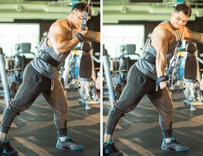Чтобы добиться весомых результатов, не помешает составить план, посвященный тому, как накачать мышцы рук. В него следует включить одно из самых простых упражнений, посвященных работе над трицепсом, – разгибания на верхнем блоке. Для его выполнения необходимо будет взяться за рукоятку так, чтобы длина хвата соответствовала ширине ваших плеч. Спина обязательно должна быть прямой, в таком положении нужно тянуть заранее установленный вес вниз до тех пор, пока ваши предплечья не займут положение, параллельное покрытию, на котором вы стоите.