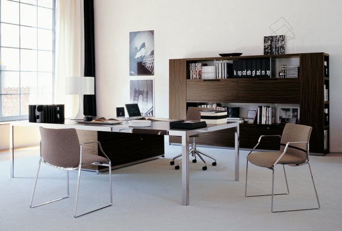 - hi-tech — оптимальный выбор для компаний, работающих с IT-технологиями, мебель обычно металлическая или пластиковая, с асимметричными формами, четкими очертаниями, часто дополнена встроенной подсветкой;