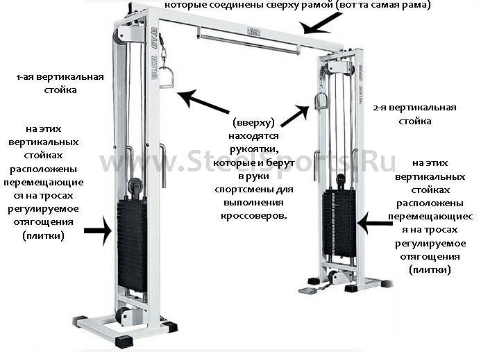 Кроссовер на блоке как вы понимаете, ВЫПОЛНЯЕТСЯ В БЛОЧНОМ ТРЕНАЖЕРЕ (специальном), который есть только в тренажерных залах (фитнес-клубах), т.е. дома выполнять данное упражнение, у вас такой возможности, как вы понимаете, нет, а покупать специально этот тренажер к себе домой, может только мажор, у которого огромная площадь квартиры, та и вообще, зачем это делать хрен его знает… что-то меня занесло не туда, куда надо.. Короче, внешне тренажер представляет собой две вертикальные стойки, которые соединены сверху рамой, на этих вертикальных стойках расположены перемещающиеся на тросах регулируемое отягощения (плитки). На других концах тросов (вверху) находятся рукоятки, которые и берут в руки спортсмены для выполнения кроссоверов. Вот так выглядит данное приспособление:
