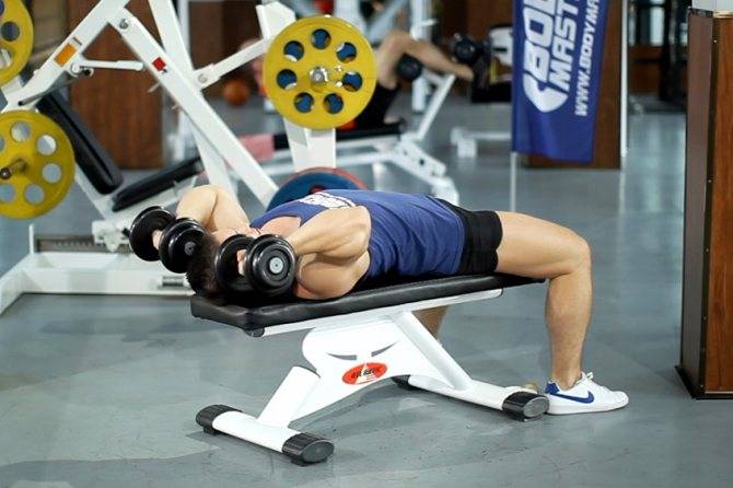 Возьмите в руки гантели, лягте на скамью спиной, упритесь ногами в пол на всю стопу. Держите гантели по сторонам от груди. Это исходное положение.