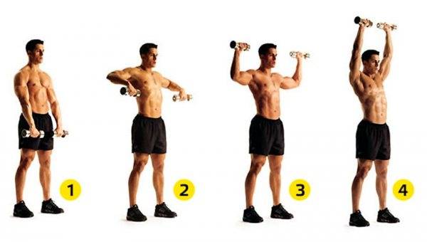 Вдохните и на выдохе начните тянуть гантели к плечам. Дойдите до низа грудных и поверните руки в плечевом суставе на 180 градусов. Осуществляйте поворотное движение до тех пор, пока запястья не окажутся прямо над локтями, а предплечья не станут перпендикулярны полу. Из той позиции выжмите гантели вверх, распрямляя руки над головой. На вдохе вернитесь в ИП, выполнив действие в обратном порядке. Повторите заданное количество раз.