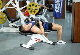 - Лягте спиной на горизонтальную скамью, выпрями руки над головой под углом 90 градусов по отношению к телу. Гантели должны оказаться над глазами.