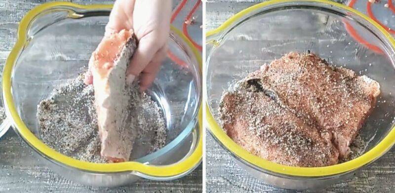 5.Возьмите стеклянную глубокую емкость и посыпьте обильно со всех сторон готовой посолочной смесью горбушу (если посуда не длинная, разрежьте филе напополам). Также вы можете посолить хребет, на котором осталось красное мясо.