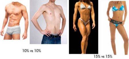 Во время похудения не только цифра на весах имеет значение, одинаковый процент жира в организме может выглядеть по-разному у людей с разным телосложением. На картинке ниже вы видите двух людей с одинаковым процентом жира, но абсолютно разными фигурами.