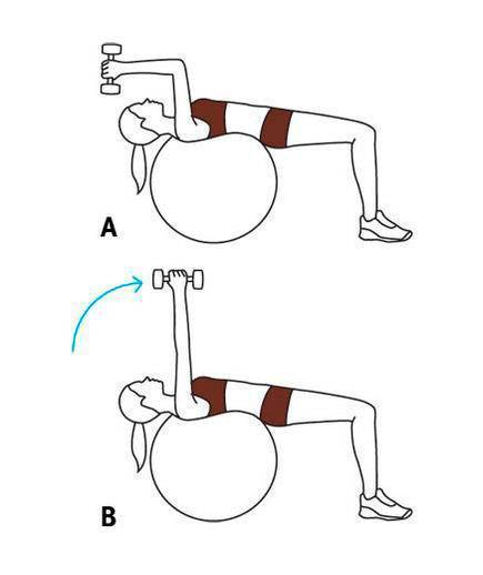 Лежите на фитнес мяче или скамейке, расширяя обе руки над головой с гантелями в каждой руке. (A) Согните локти так, чтобы предплечья были параллельны полу. (Б) Медленно выпрямите руки, затем опустите их в исходное положение. Повторите 12 раз.