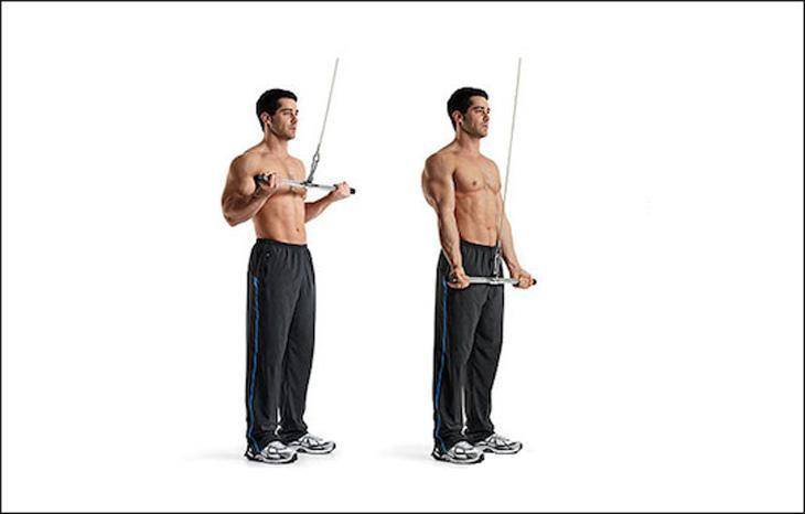 Возьмитесь за канатную рукоять, зафиксированную на верхнем креплении. Ладони должны смотреть друг на друга. Потяните за рукоять, чтобы поднять вес, при этом локти должны быть прижаты к туловищу. Сохраняя неподвижное положение корпуса, разогните руки вниз и разведите в стороны, чтобы задействовать трицепс, затем медленно верните в исходную позицию. Могут эффективно выполнять женщины.
