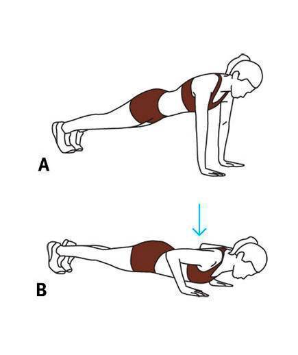 (Б) Согните руки медленно, пока локти не достигнут угла в 90 градусов, а затем поднимитесь обратно вверх, чтобы выпрямиться. Выполните 12 повторений.