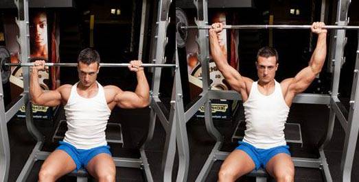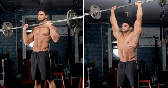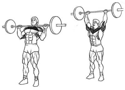 Исходное положение: стоя. Взять штангу и завести ее за голову, после чего вытолкнуть вверх. Сделать 10 повторений 3-4 подхода