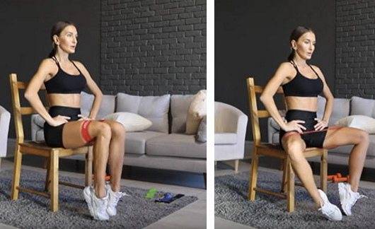 Фитнес-резинку закрепляют в районе голеней и соблюдают параллельность стоп при выполнении тренировочных движений. Девушки могут выполнять упражнения в положении сидя на стуле. Резинку размещают чуть выше коленных суставов, чтобы основную нагрузку воспринимали мышцы внутренний и внешней поверхности бедер.