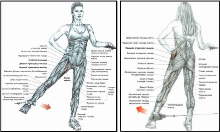 В каком бы тренажере Вы ни выполняли отведение ноги назад, рабочие мышечные группы будут одни и те же, хотя, акцент нагрузки может смещаться. В любом случае, основными рабочими мышцами будут ягодицы и бицепс бедра, за счет которых и будет выполняться позитивная фаза упражнения. Остальные мышцы выполняют функцию стабилизаторов, и их участие зависит от положения корпуса во время выполнения упражнения