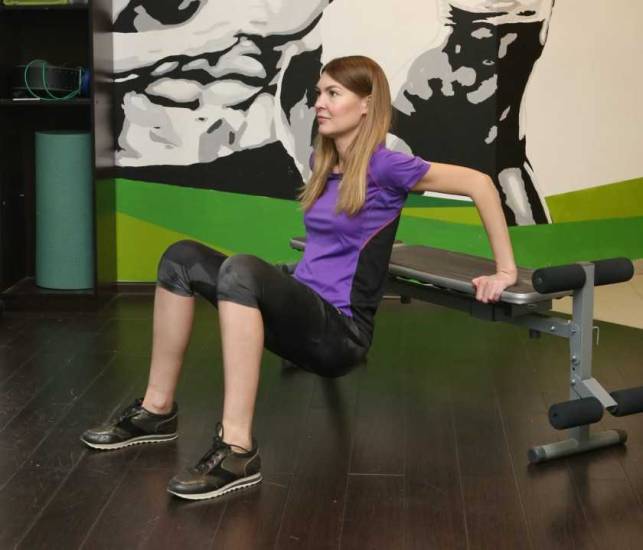 Наиболее простой вариант упражнения – это отжимания от скамьи с ногами на полу, руки сзади на скамейке, при этом если согнуть ноги в коленях и подтянуть к себе, оно станет максимально лёгким.
