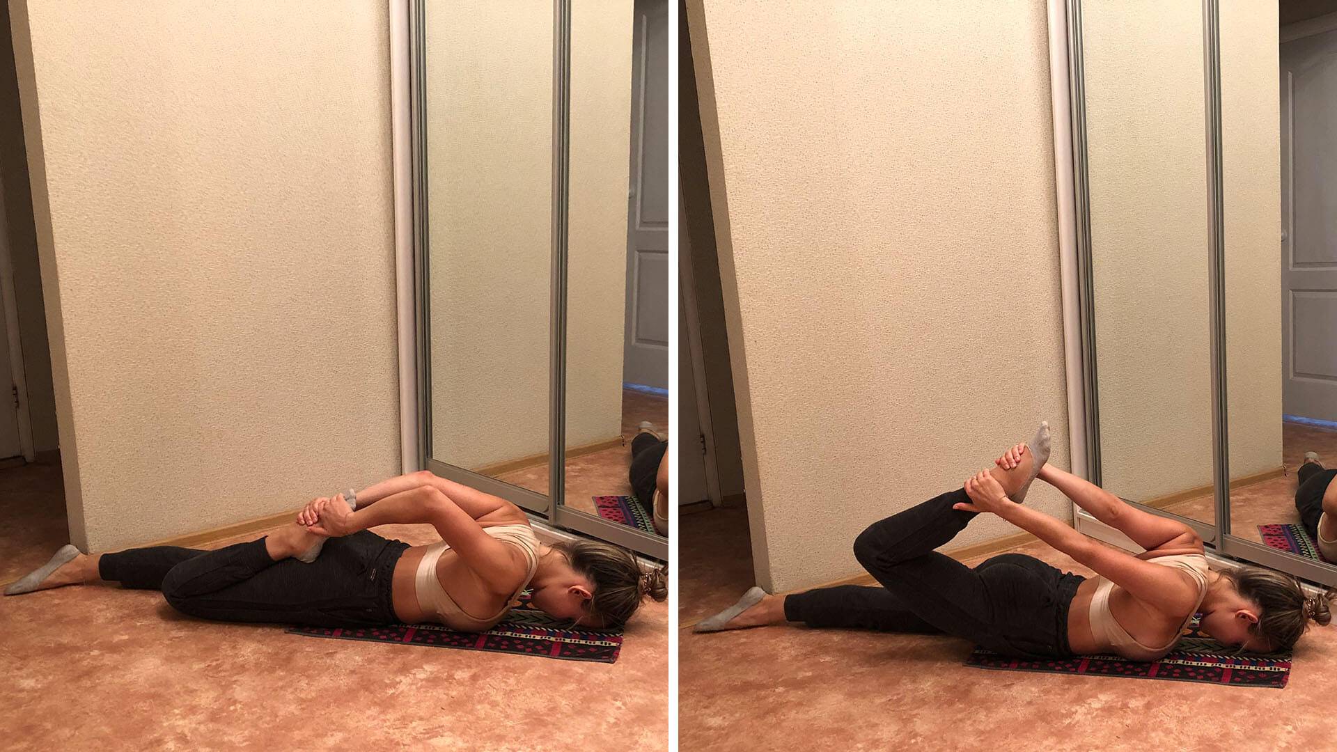 - Из положения лежа на животе согните ногу в колене к ягодице.