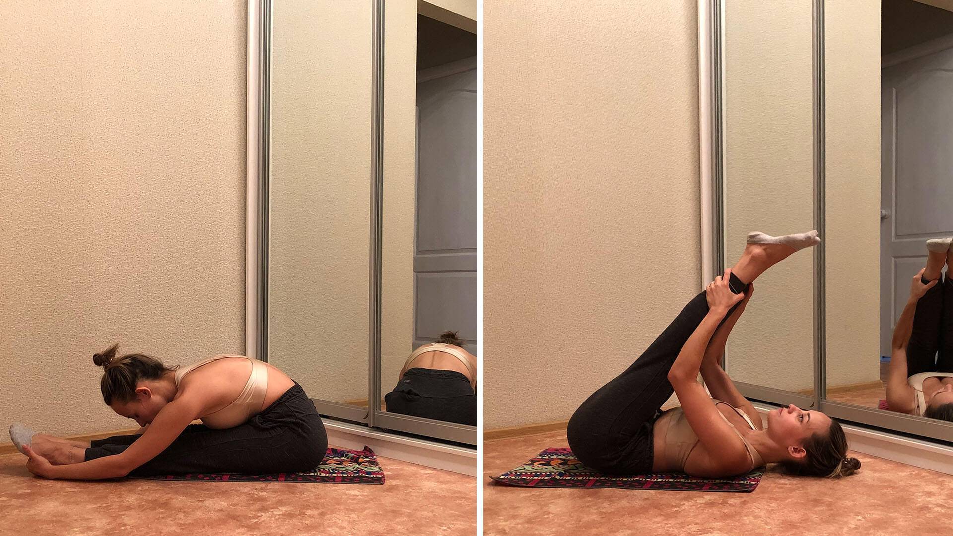 - За колени оттягивайте ноги как можно ниже, помогайте руками.