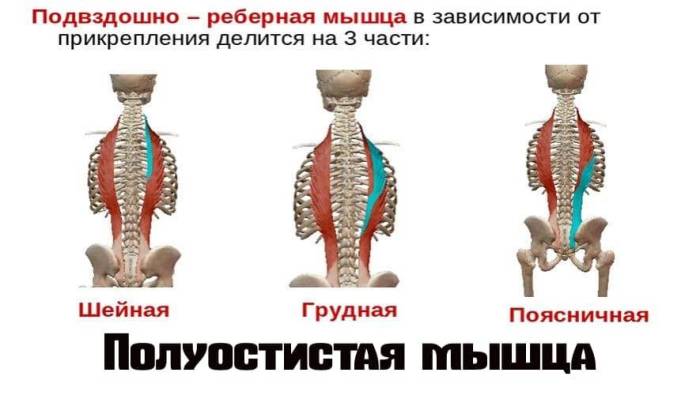 1. Подвздошно — реберная(полуостистая)мышца. Ее пучки перебрасываются через 5 позвонков и более. Данная мышца располагается поверхностнее остальных. Также она разделяется на 3 части:
