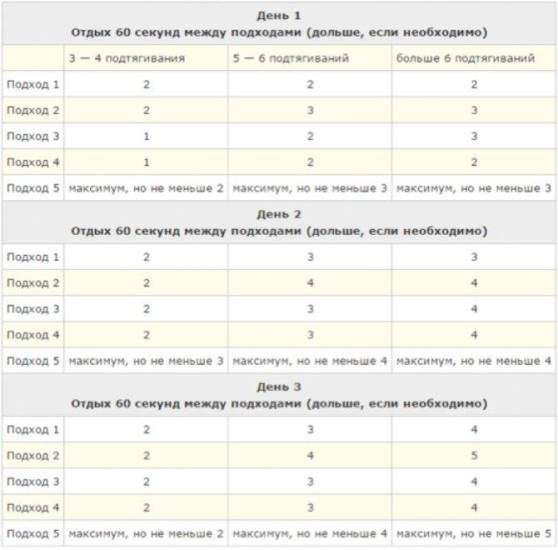 - Если в последнем тесте вы подтянулись 3-4 раза – занимайтесь по первой колонке таблицы.