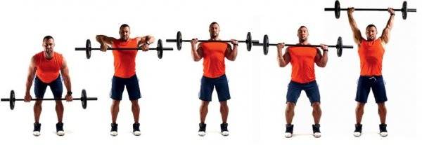 Фото 2. Последовательная техника выполнения жима штанги стоя. Снаряд необходимо поднять над головой на вытянутых руках.