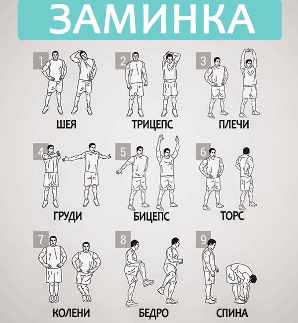 Прежде чем приступать к тренировке, вы должны провести разминку . Она поможет вам разогреть мышцы и суставы, а также убережёт от повреждений и травм.