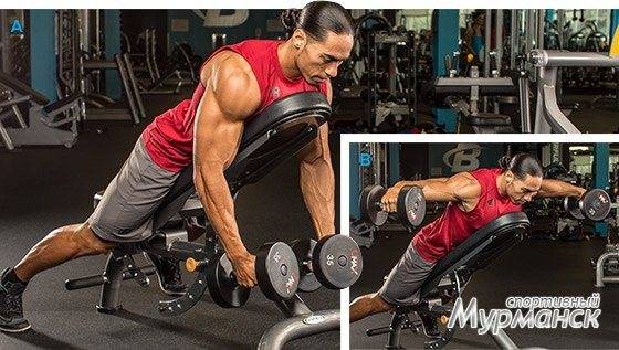 Данное упражнение выполняется с гантелями на наклонной скамье. Гантели берите не большие, на начальном этапе. Лягте на скамью, под углом 20-30 градусов, лицом вниз. Руки должны быть вытянуты перед собой, и образовывать с корпусом угол в 90 градусов, ладони при этом обращены вниз. Из этого положения начинайте выполнять разводку, с разворотом кистей, так как это показано на рисунке ниже.{banner_st-d-2}