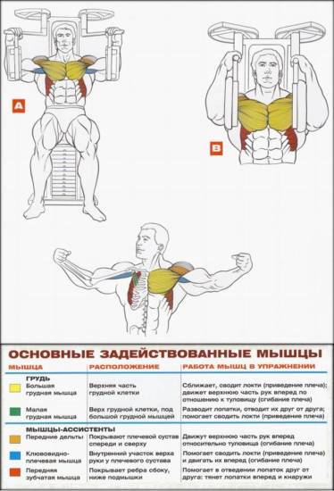 Тренажер «бабочка» воздействует на мускулатуру груди и передние зубчатые мышцы. Нагрузка приходится на стернальные (нижние) головки больших мышц. Роль синергистов выполняют: